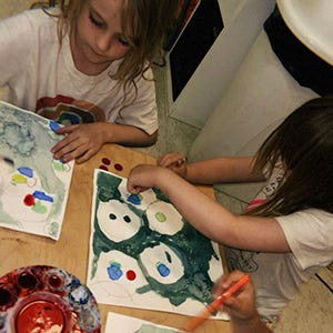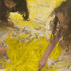The large-scale collaborative painting in brilliant yellows then reds then purples happened through dialogue. Where should this mark go? What happens if we overlap here? Young artists made choices together, watched the surface shift with each decisionโmany hands working on one composition, countless conversations unfolding about what to do next. Painting feet brought transformation into the bodyโwalking across paper, feeling texture, leaving traces. The refrain โwe can be the onesโ became real through shared action.