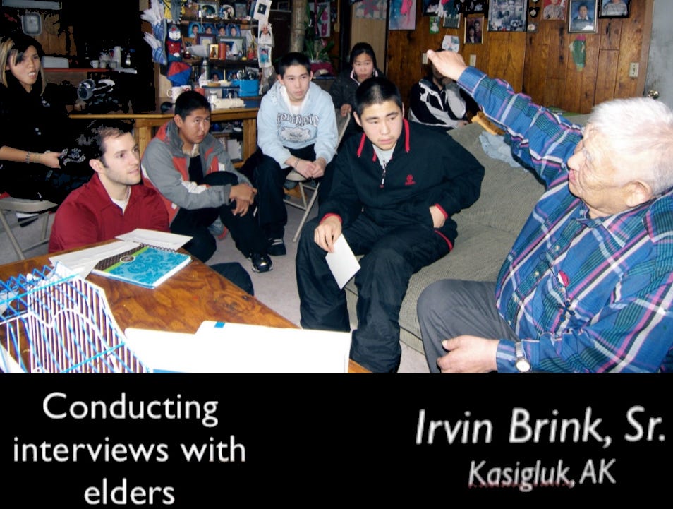 Those who lived through this change—mandatory U.S. schooling, punishment for speaking one's native language, and imposed restrictions that made subsistence ways untenable—are grandparents now. Shouldering the traumas they experienced, many resiliently worked together to bring about shifts that are present today, such as Yup'ik immersion schools like the one in Kasigluk, to retain and revitalize their culture. The youth, however, do not have firsthand experience of pre-statehood, nor did they witness how hard their elders worked to preserve their culture. In a world that continues to shift around them, how do young people connect to these deep traditions, and how are stories passed down? Story, which Yup'ik culture has always relied on to preserve history, traditions, and values, remains one active way families and communities bridge generational understanding.1